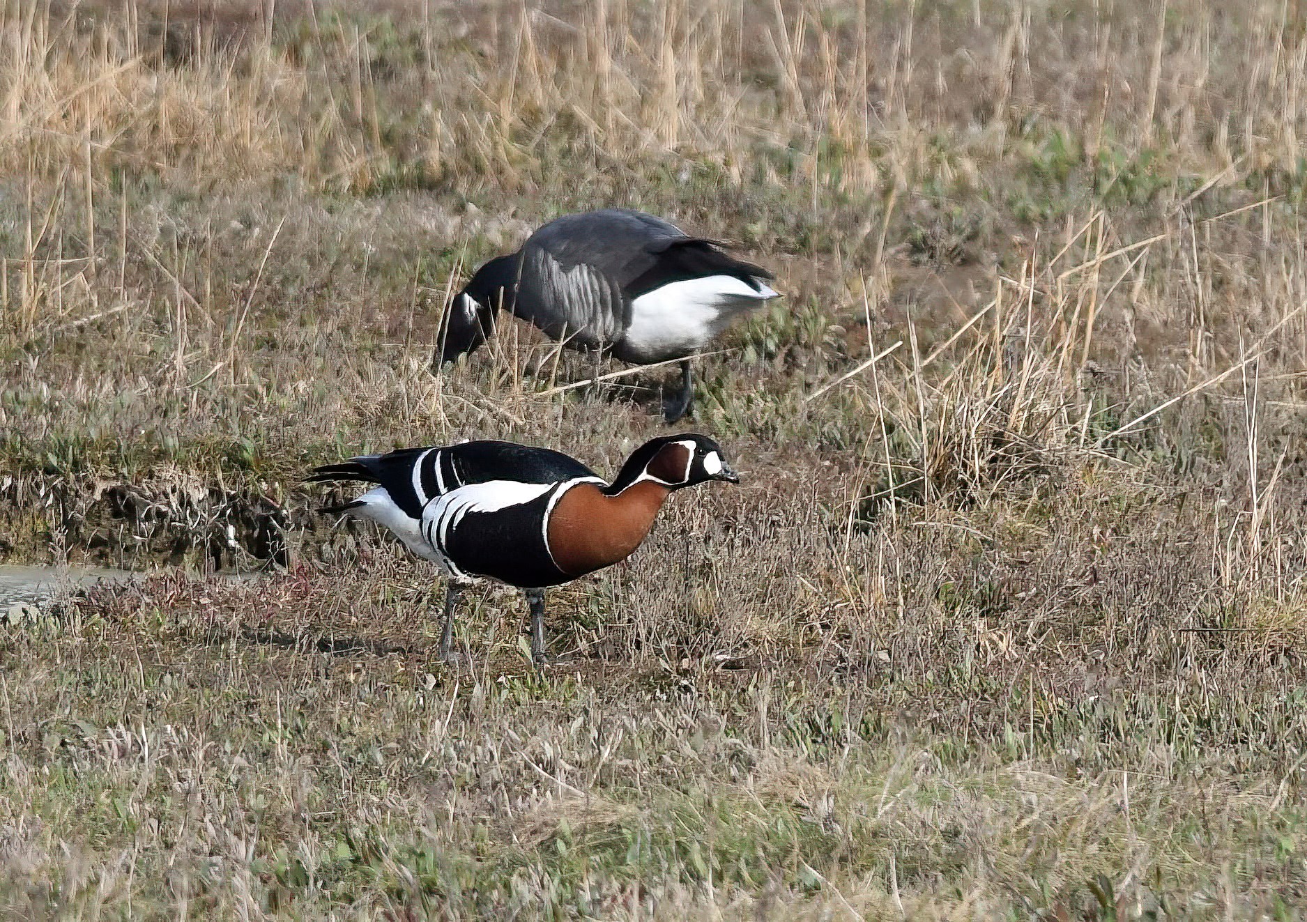 The female, which is brown and the bib not so crisp white as the male.